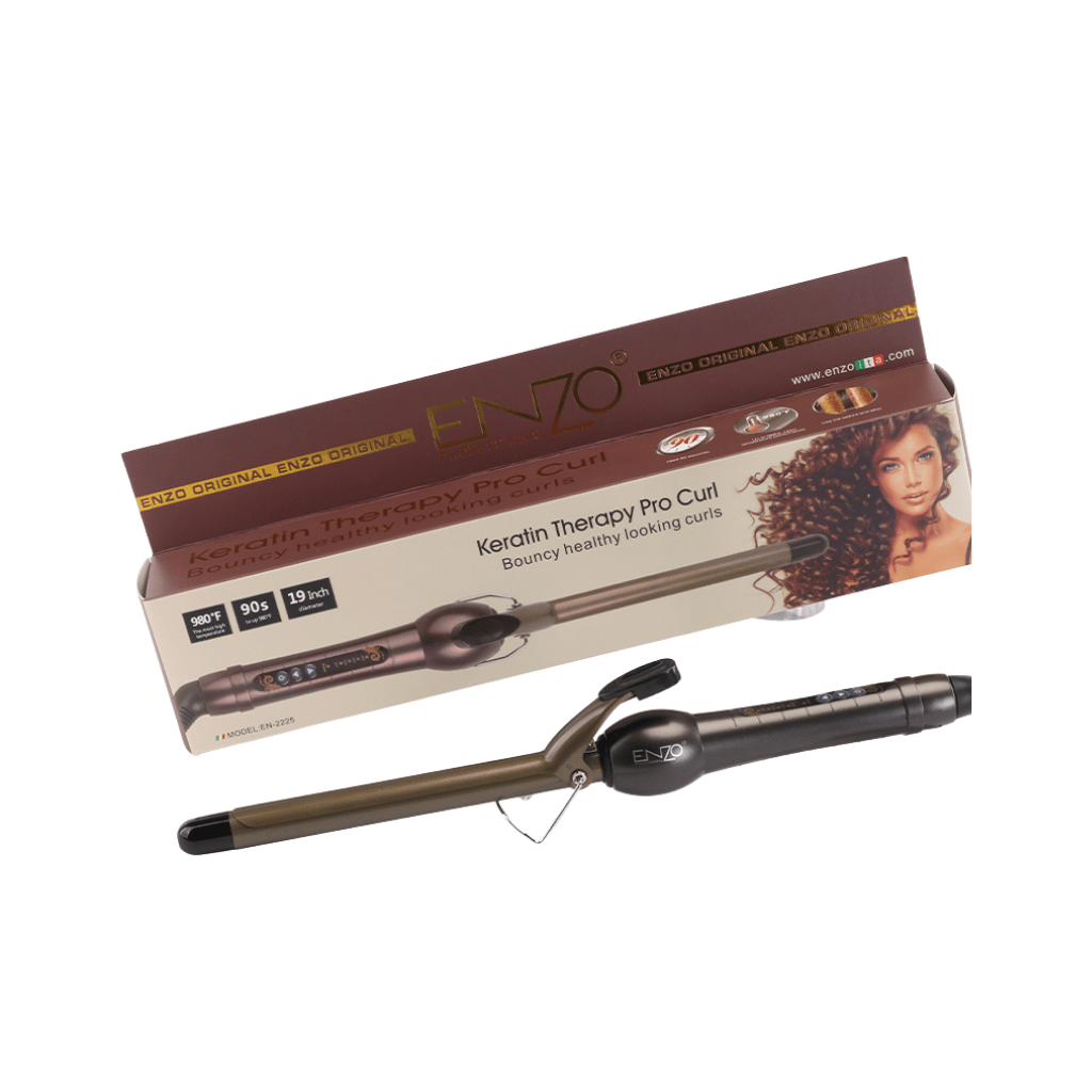 A professional ENZO curling iron for bouncy, healthy curls. It features a 19mm barrel, an ultra-fast 90-second heat-up time, and a high temperature for effective styling.