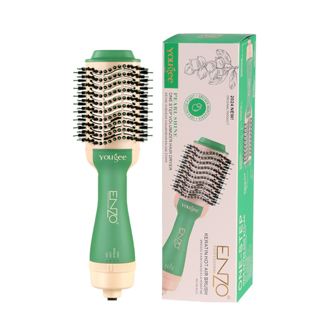 Achieve voluminous, shiny hair in a single step with the ENZO Pearl Shine One-Step Hair Dryer & Volumizer. This revolutionary 2-in-1 styling tool combines the power of a hair dryer with the shape and control of a styling brush, cutting your styling time in half. Featuring a unique Keratin-infused barrel, it helps to nourish your hair and create a smooth, frizz-free finish. The special “Pearl Shine” technology adds an extra layer of brilliance, leaving your hair with an incredible, healthy-looking luster. Designed for all hair types, this one-step tool is easy to use and helps you create a professional salon-quality blowout at home. The lightweight, ergonomic design and multiple heat settings ensure a comfortable and customized styling experience every time.