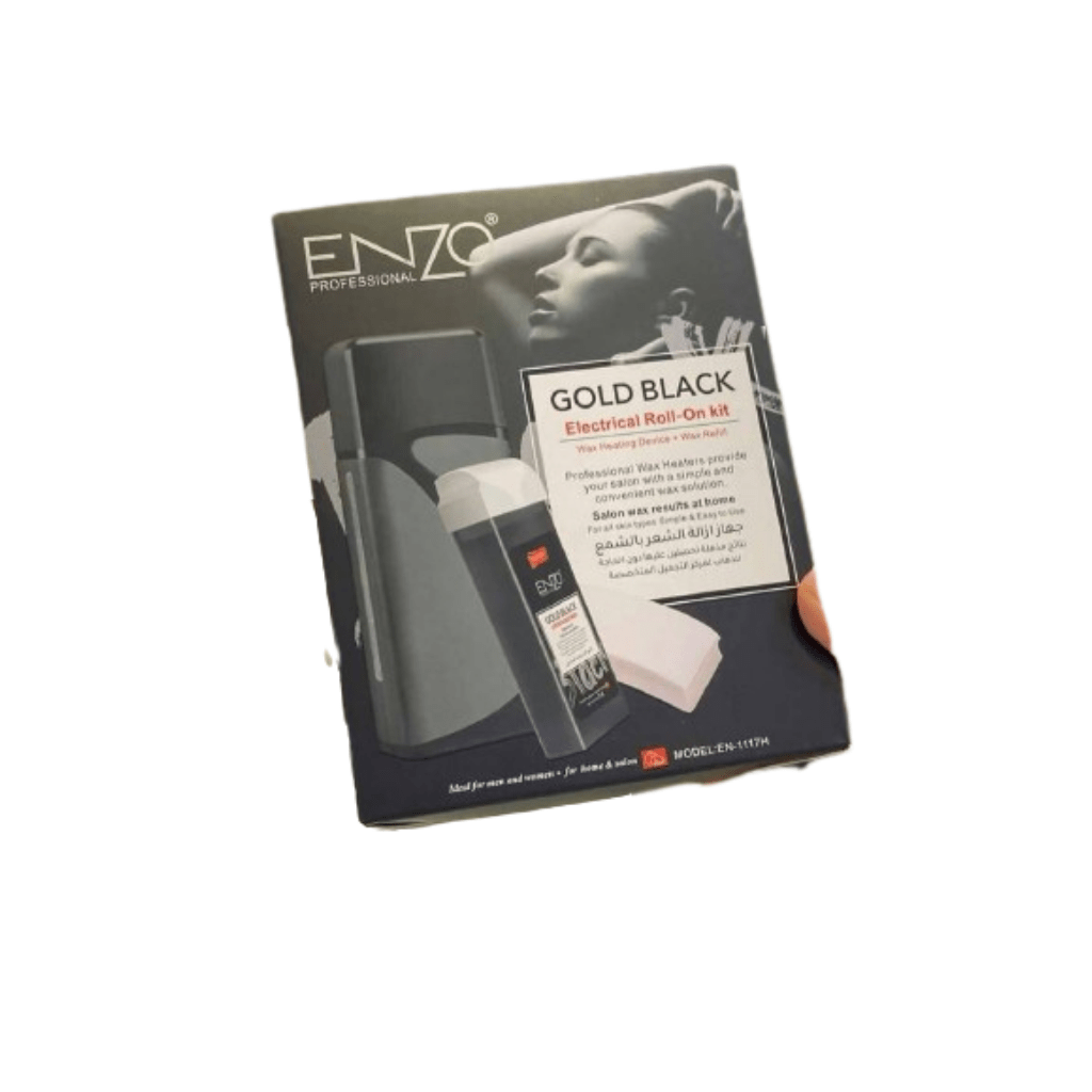 A complete ENZO PROFESSIONAL Gold Black electrical roll-on kit for at-home waxing. It includes a heating device and wax roll for a clean, professional-quality hair removal experience.