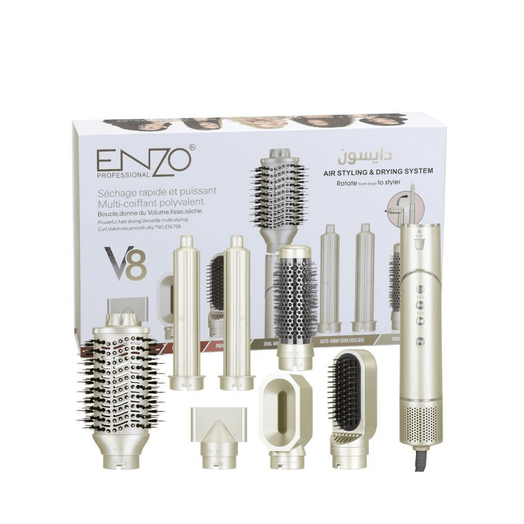 The ENZO Professional V8 Air Styling System is a complete hair styling kit with a powerful main unit and multiple interchangeable attachments to effortlessly dry, curl, volumize, and straighten your hair.