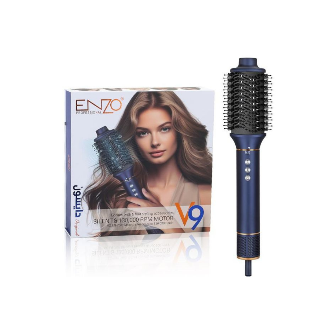 The Enzo Professional V9 Air Styler is a multi-functional hair tool with a powerful, 130,000 RPM silent motor and five interchangeable attachments for drying, curling, and styling your hair.